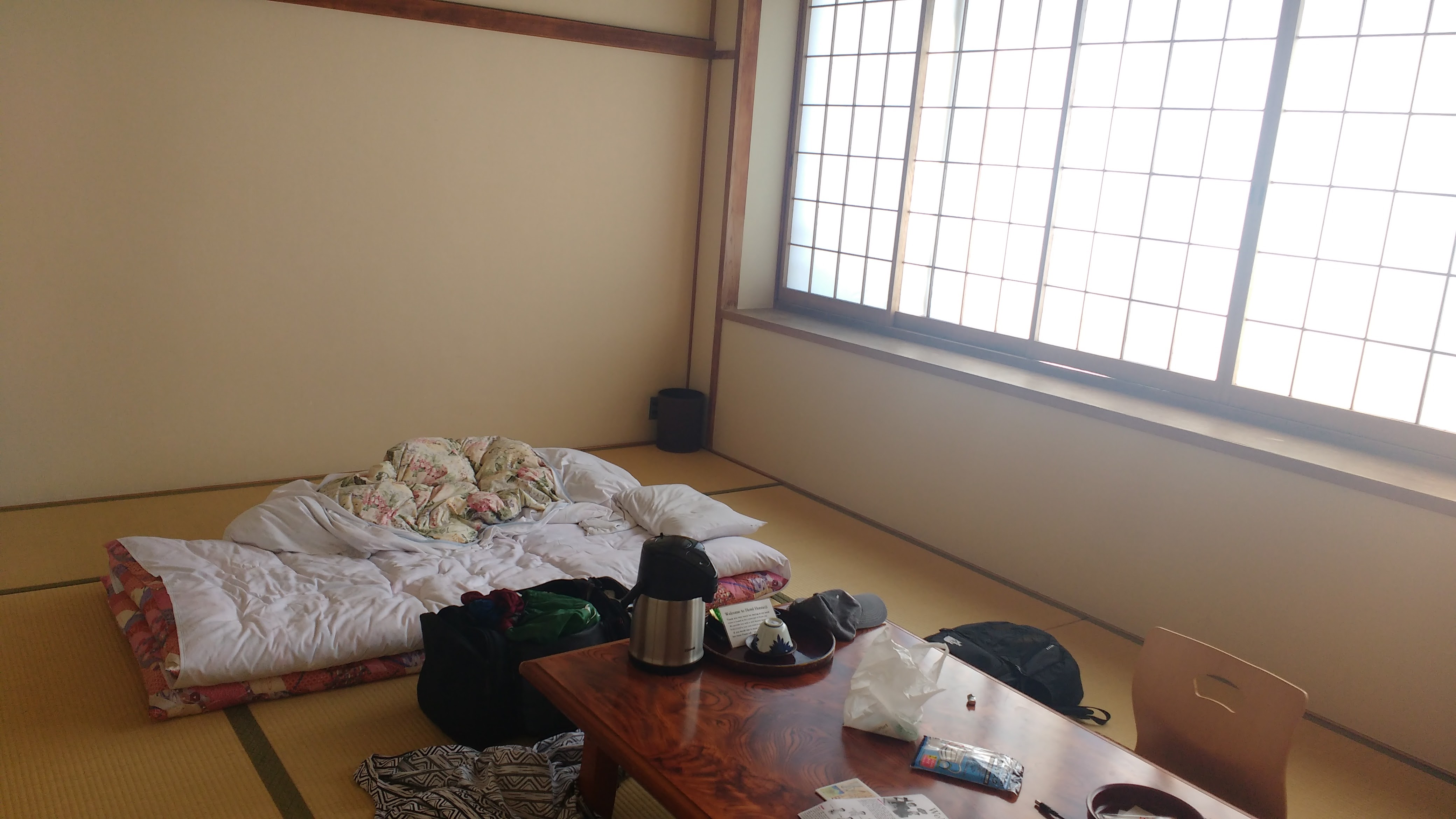 img_20160826_092244760 September 29, 2016 Return to: Traveling Japan, Part 2: KyotoFull resolution (4160 × 2340) Image navigation Previous Image Next Image I didn't care for the futon in Atami, but this place was nicer and I slept wonderfully.